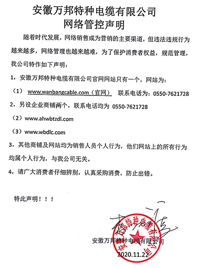 鄭重聲明:安徽萬邦特種電纜有限公司官方網站為:www_wanbangcable_com.menghuaxi.cn,除此之外無任何子網站或合作網站,其余均為假冒偽劣。電話:0550-7621728 13485756353 地 址:安徽省天長市滁州高新技術產業開發區經四路29號
